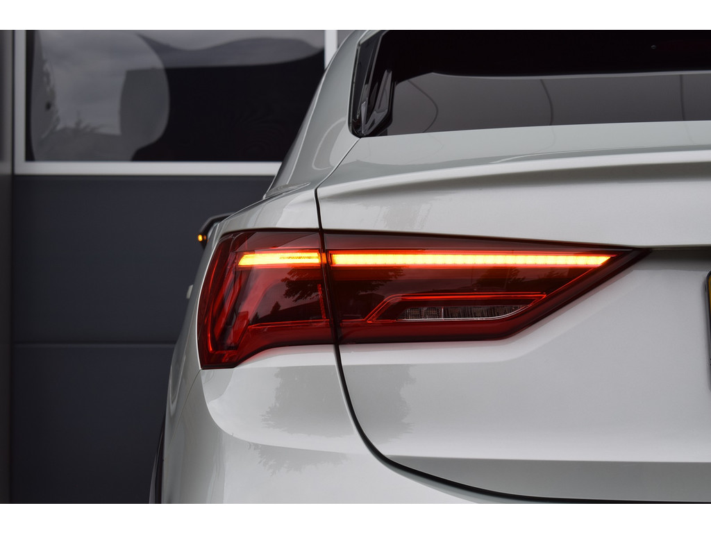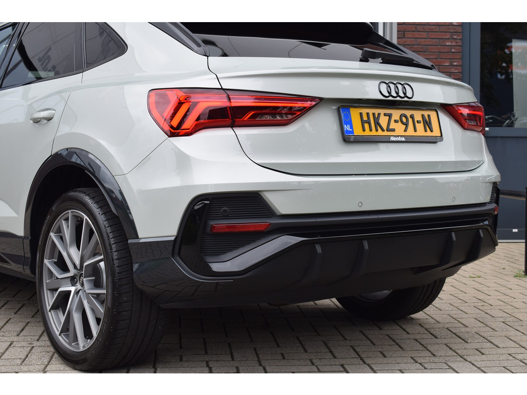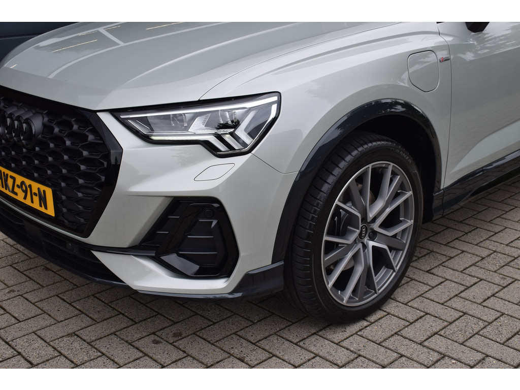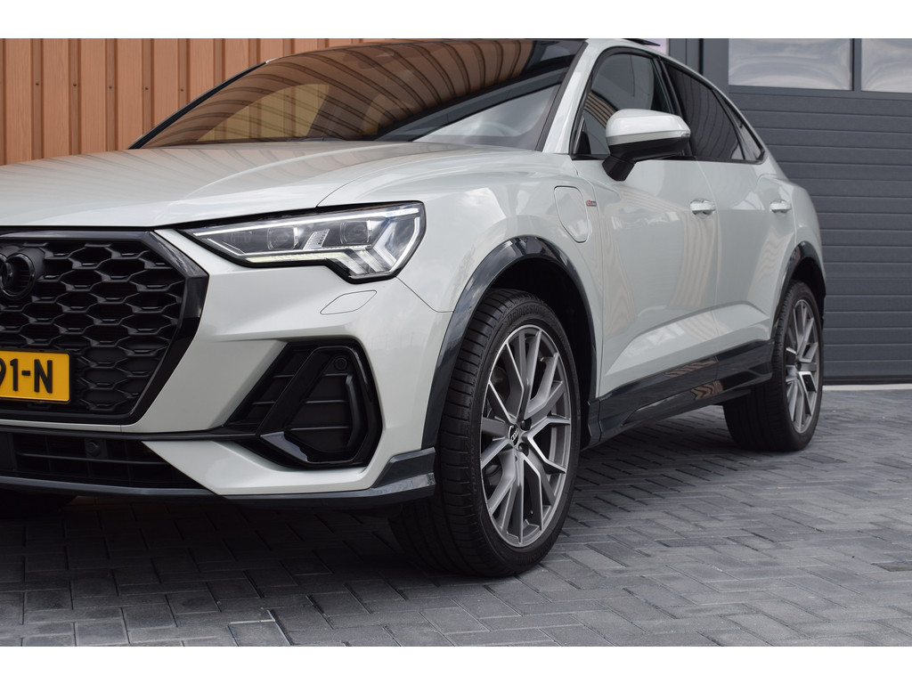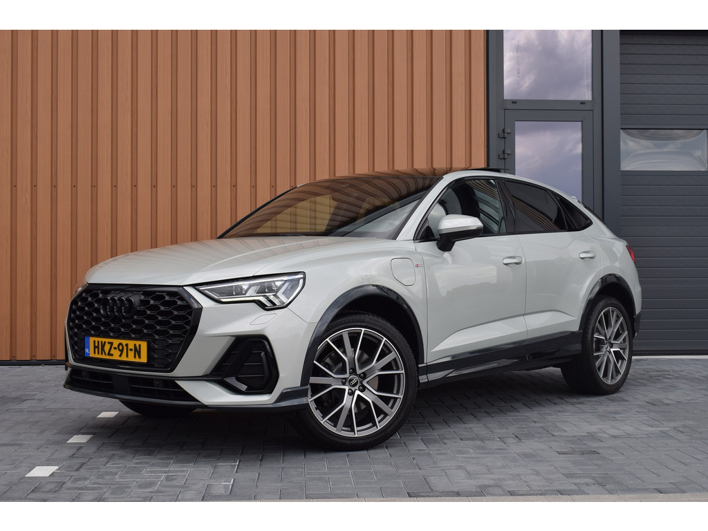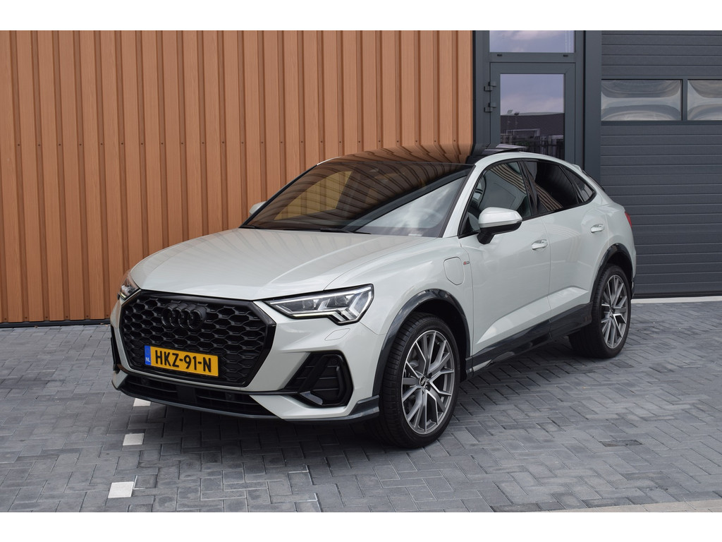 Audi Q3 Sportback 45 TFSI e S-line. Uitgevoerd in de kleur Tau Zilver Metallic en voorzien van de volgende opties: Panoramadak, Achteruitrijcamera, Half lederen / alca...