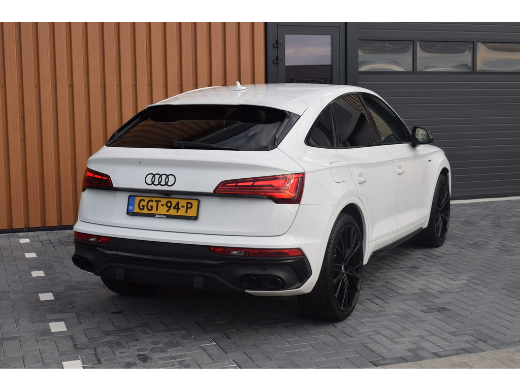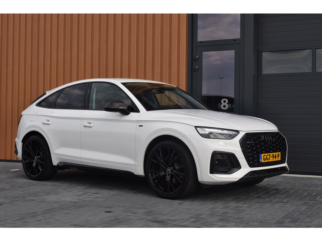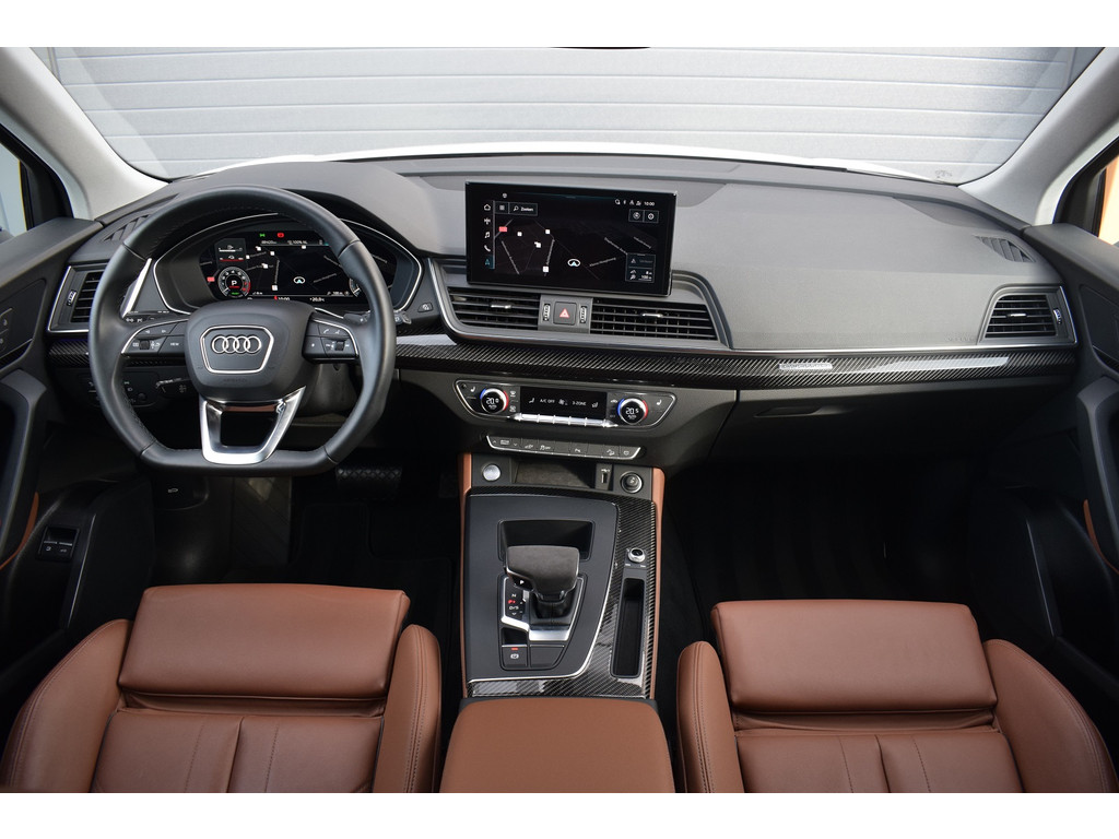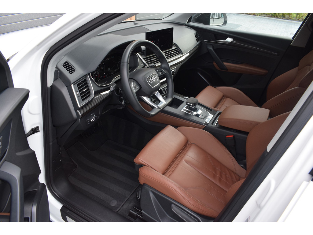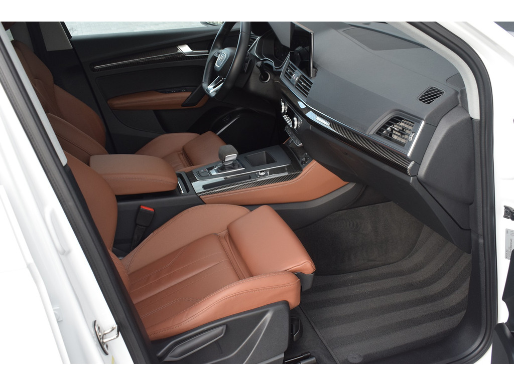 Audi Q5 Sportback 50 TFSI e 299pk S-line. Uitgevoerd in Ibis White met Cognac lederen interieur. Verder voorzien van o.a.: Luchtvering, Virutal Cockpit, MMI Navigaties...