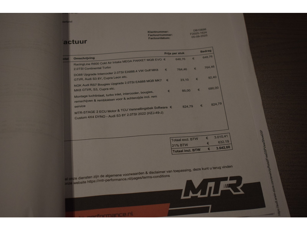 Audi S3 Sportback 2.0 TFSI Quattro. Unieke S3 welke door MTR Performance is voorzien van Stage 2 softwaretuning, RacingLine R600 Cold Air Intake, DO88 Upgrade intercooler t.w.v. € 3642,60. Deze aanpassingen zijn gedaan op 09-2025. Door deze aanpassingen heeft de S3 een vermogen van 457pk / 597NM. Documentatie en uitdraai testbank is aanwezig. Verder is de auto recent voorzien van groot onderhoud op 28-01-2026 bij 92.791km. De S3 is voorzien van mooie opties zoals Panoramadak, Virtual Cockpit, MMI Navigatiesysteem, B&O soundsysteem, Climate control, Stoelverwarming, Cruise Control, Half lederen interieur met elektrisch verstelbare voorstoelen, Multifunctioneel stuurwiel met afgevlakte onderzijde, Parkeersensoren voor en achter, Achteruitrijcamera, Buitenspiegels elektrisch verwarm- en inklapbaar, Elektrisch bedienbare kindersloten, Aluminium pedalen, Elektrisch bedienbare achterklep, LED koplampen en achterlichten, Sfeerverlichting interieur. Bedrijfsinformatie: Voor het bezichtigen van een occasion werken wij op afspraak, u kunt ons bereiken op 0522-701091, via whatsapp op 0610415909 of per mail op info@hentra.nl. Wilt u deze auto financieren? Kijk op onze website voor de mogelijkheden!